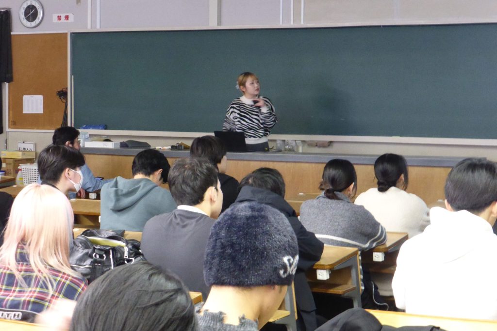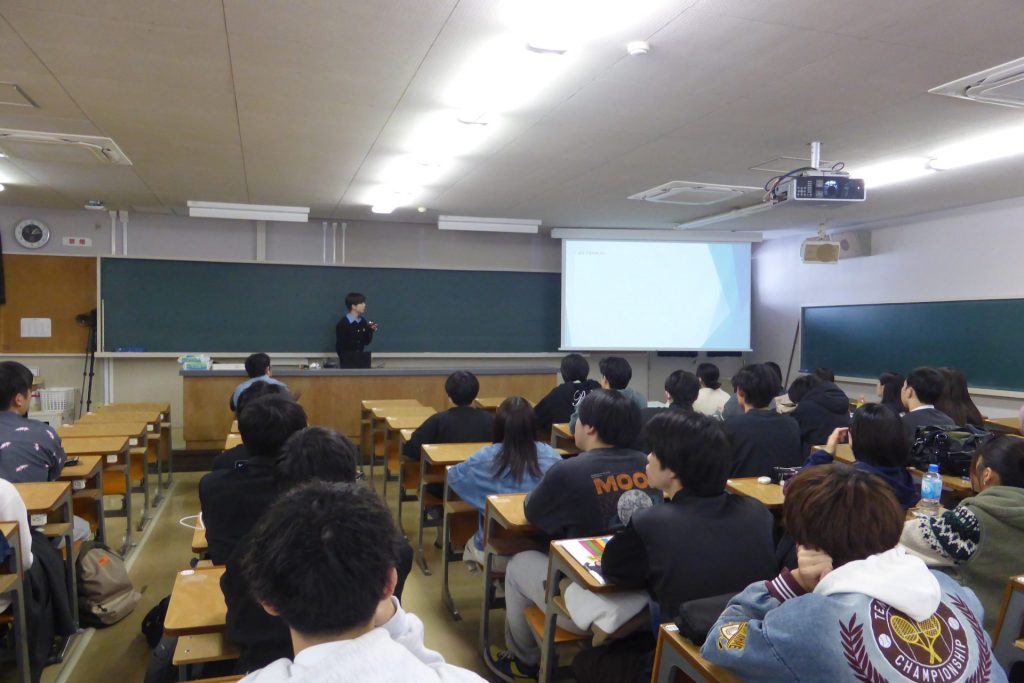 令和7 年度キャリア教育調整委員の宮内先生から今年度の報告があったあと、企業内定者2名・教員採用試験合格者1名に自身の体験談を話していただきました。