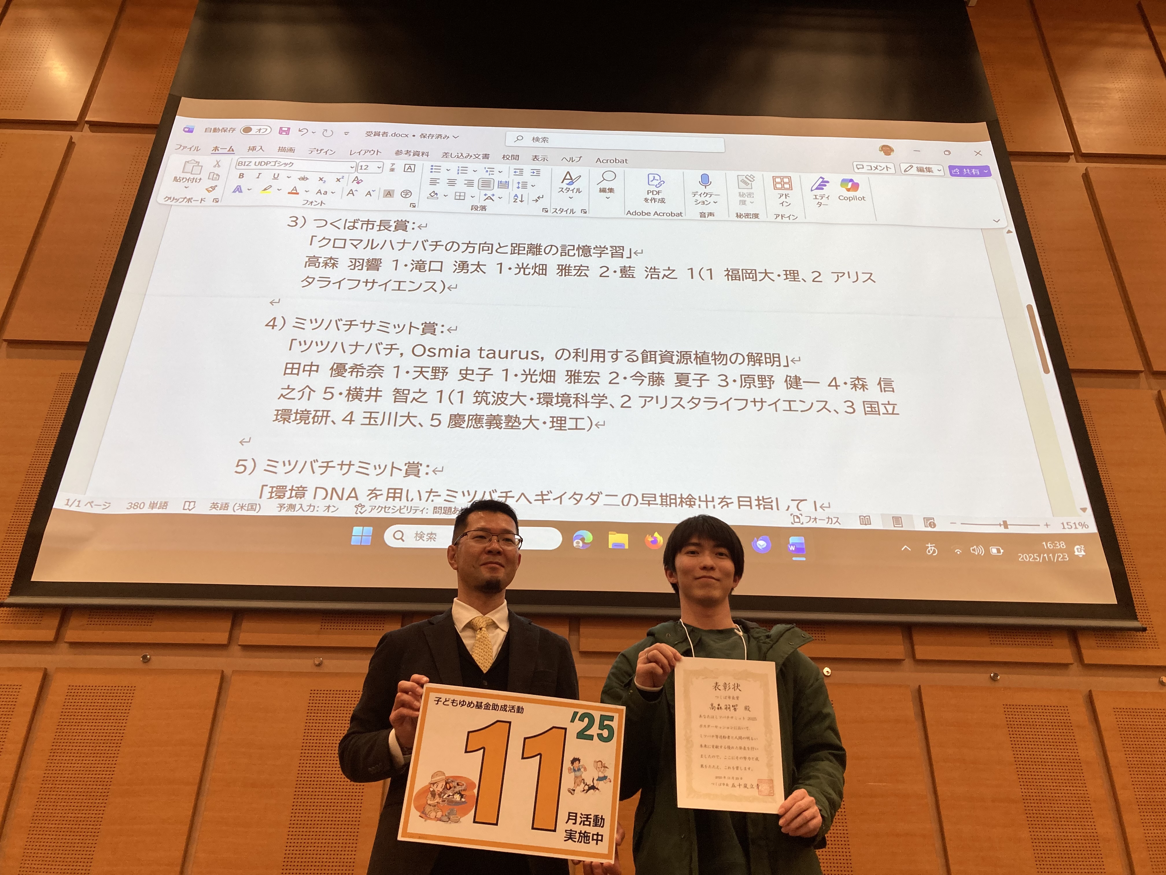 2025年11月22-25日につくば国際会議場で開催されたミツバチサミット2025において高森羽響さん(地球圏科学科を卒業し、現在大学院理学研究科地球圏科学専攻生物科学専修1年、進化脳科学研究室所属)がポスター発表でつくば市長賞を受賞しました。タイトルは「クロマルハナバチの方向と距離の記憶学習」です。