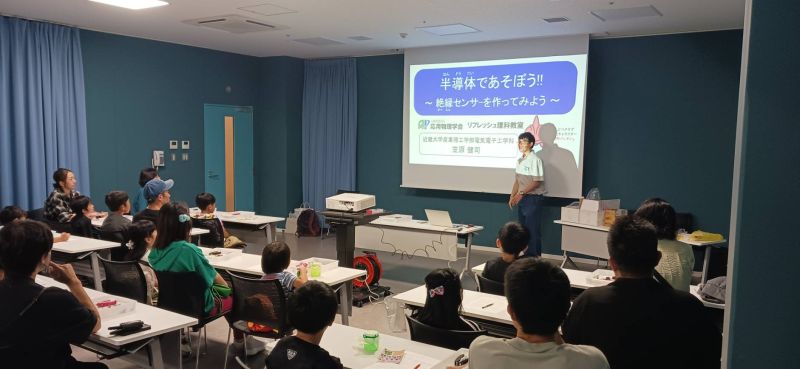 応用物理学会主催のリフレッシュ理科教室が飯塚市総合体育館で開催されました。テーマは「半導体で遊ぼう」で、絶縁センサを作製しました。