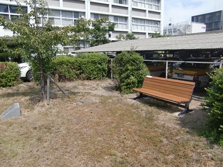 設置場所は「9号館やポーリングの桜なんかを眺めながら、思索に耽ったり、歓談をしたりできるかな」という永田学長の希望で決めていただいたものです。