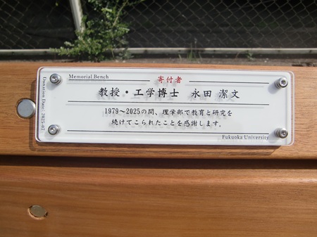 永田学長より、50周年記念植樹(当時、永田学部長)の脇に、メモリアルベンチを寄贈していただきました。